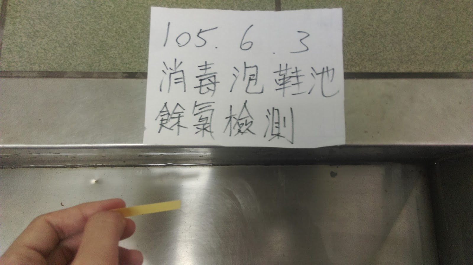 二、檢測方法:取餘氯檢測試紙檢測泡鞋池水質,立即觀察比較顏色與標準顏色是屬於何範圍(25-200ppm)。